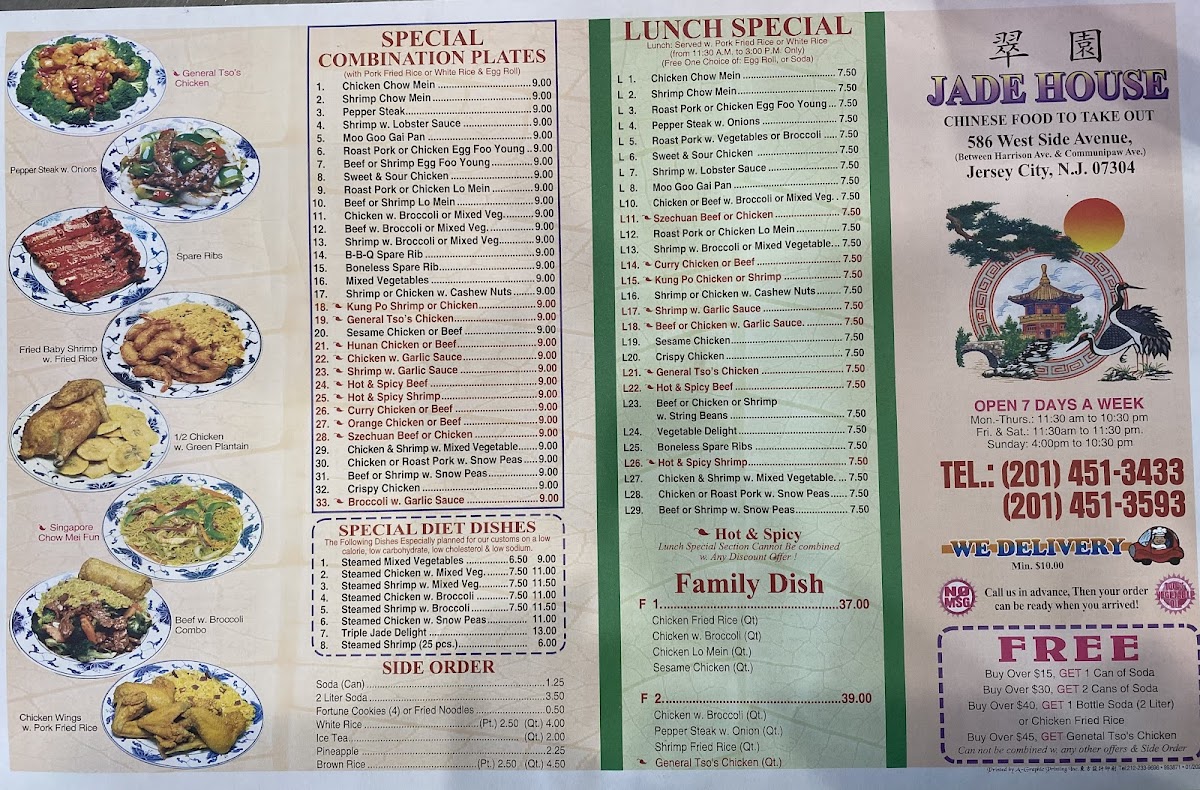 Welcome to Jade House Menu, where every dish is crafted with care and passion. Located at 586 West Side Ave, Jersey City, NJ, this hidden gem offers a variety of flavors that will make you feel right at home. Whether you're in the mood for something spicy, savory, or light, Jade House has something to satisfy every craving. The menu is filled with mouthwatering options, from traditional favorites to unique twists on classic dishes. You'll find fresh ingredients and bold spices in every bite, all made with the finest quality.